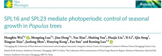 近日,西南大学PA视讯罗克明教授团队在国际主流植物学期刊New Phytologist在线发表了题为“SPL16 and SPL23 mediate photoperiodic control of seasonal growth inPopulustrees”的研究论文,报道了短日照条件下PIF8-miR156-SPL16/23-FT2/BRC1级联通路介导调控杨树生长停止和进入休眠过程。该研究建立了光周期感知模块phyB-PIF8与树木物候调控新模块miR156-SPL16/23的直接联系,为树木季节性生长背后的分子机制提供了新的见解。
