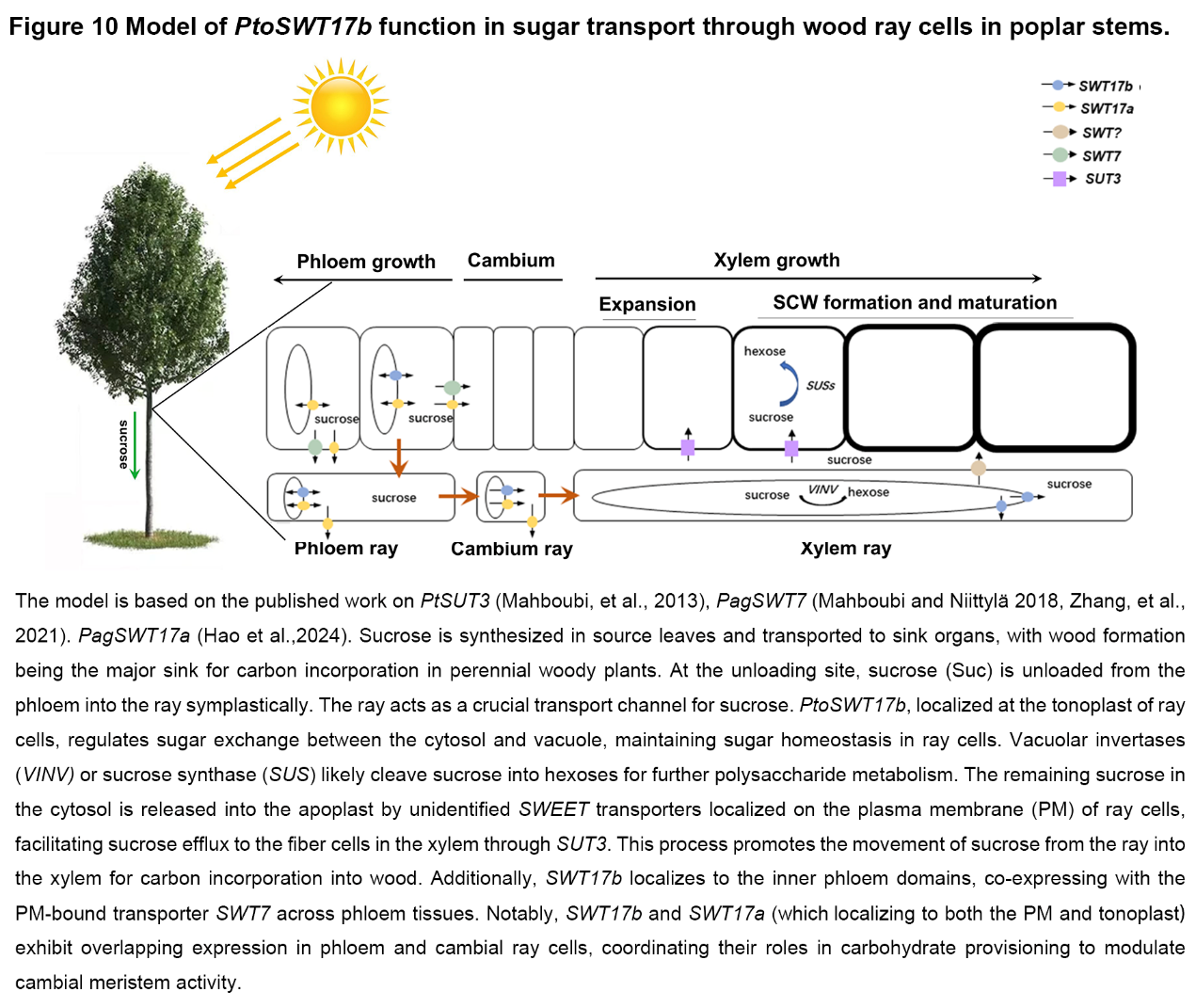 木材来源于多年生林木的茎干,其发育是以碳需求为核心的过程,对木质部发育和次生壁的形成至关重要。射线组织在林木茎干的径向运输系统中起关键作用,但对其运输的调控机制及射线运输效率对木材发育的影响尚不明确。SUGAR WILL EVENTUALLY BE EXPORTED TRANSPORTERs(SWEETs)是碳水化合物从光合源组织向库组织流动的关键转运蛋白,然而杨树SWEETs在糖从茎中的韧皮组织径向流动至木质部的过程中是否发挥作用仍不清楚。本研究表明,毛白杨PtoSWEET17b基因在射线细胞中特异高表达,并定位于液泡膜。酵母功能分析证明,PtoSWEET17b是一种高效的蔗糖转运蛋白。研究发现,敲除PtoSWEET17b会导致13C标记同化物从叶片流向木质部的分配量减少,PtoSWEET17b突变体中木质部的可溶性糖含量降低也进一步证明此发现。此外,PtoSWEET17b突变体还伴随缺陷的木质部形成以及茎中下降的纤维素和半纤维素含量。相反,过表达PtoSWEET17b则能增加木质部产量和可溶性糖含量。这些结果共同确立了PtoSWEET17b在调控糖从射线组织到木质部的径向运输功能,为杨树茎的糖径向运输机制提供了新见解。
