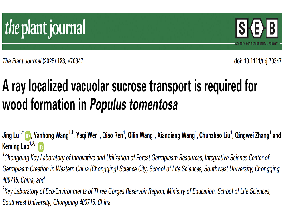 2025年7月28日,The Plant Journal在线发表西南大学PA视讯罗克明教授团队题为“A ray localized vacuolar sucrose transport is required for wood formation in Populus tomentosa” 的研究论文。该研究揭示了射线表达蔗糖转运蛋白PtoSWEET17b通过调控木材中糖的卸载分配促进木材发育的分子机理。