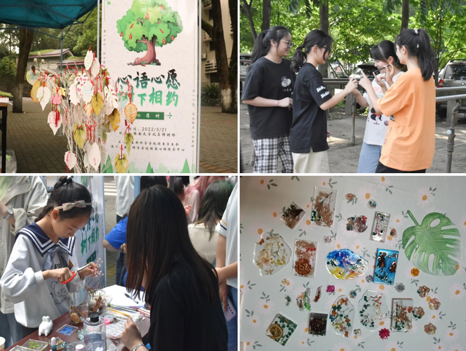 延伸学科内涵,丰富育人形式。将生命教育融入心理育人全过程,创新心理育人方式方法,搭建生命科学和心理健康之间的桥梁,开展“以生相约,邂逅自己”心理健康教育主题活动。围绕学生、关照学生、服务学生,充分发挥学生主观能动性和创造性,设计“水晶滴胶制作”、“心愿树”、“自画像征集比赛”和“心理团辅”等多角度、全方位、立体式的心理体验活动,让学生从“课桌旁”的听众变成“舞台上”的主角,形成心理健康教育与生命教育有效结合机制,培养大学生积极情感和健康心态。