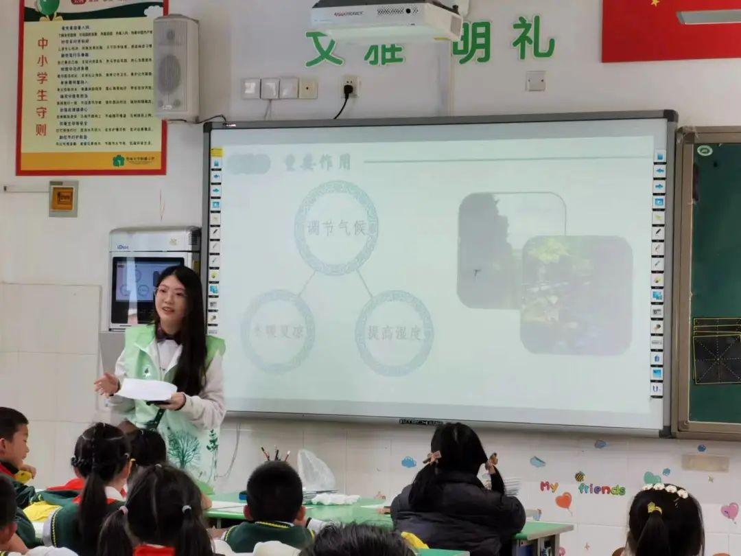 介绍完活动内容后,志愿者们开始进行宣讲。由叶子和缙云山为切入点,志愿者们向同学们科普了森林在生态系统中的作用,如调节气候、涵养水源、防风固沙、防止水土流失等,接着引入近几年森林面积减少的影响,由此转入环境污染现象,导入“绿水青山就是金山银山”的生态文明理念,引导小朋友们从自身做起,从小事做起,共同推进美丽中国的建设。