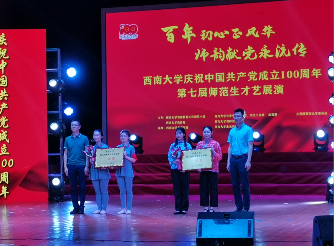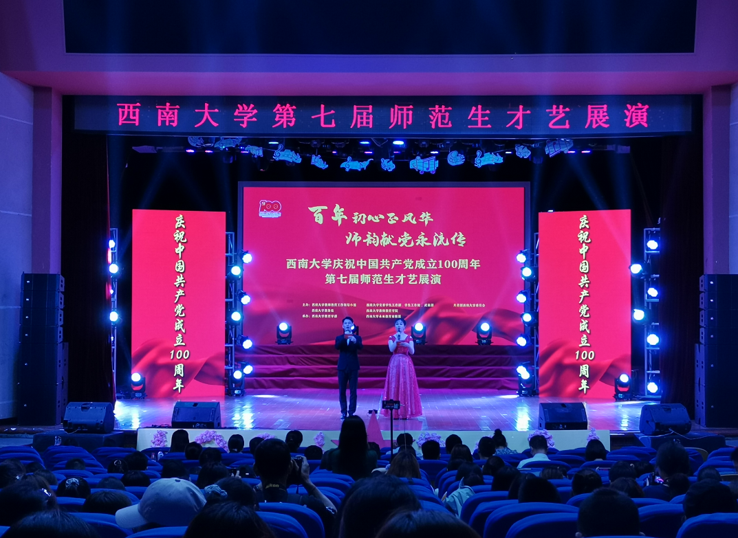 为纪念党的百年华诞,讴歌中国共产党领导中国革命和建设取得的伟大成就,全面培养和提高师范生的才艺技能,促进师范生德智体美全面发展,2021年5月16日下午2:30,西南大学第七届师范生才艺展演于光大礼堂顺利举行。