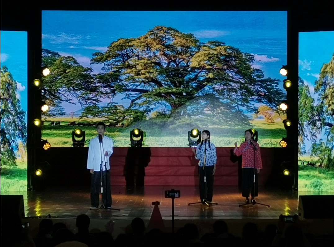 本次比赛共有16个单位参加。选手们用饱含深情的诵读、别出心裁的舞蹈、嘹亮动听的歌声为党的生日献礼。在各式各样、精彩纷呈的节目中,我院学子简帮建、韦慧婷、肖诗怡所表演的节目“我的墓碑”,以老槐树为线索,讲述了一个发生在老槐村的感人至深的故事。奋起反抗的老槐村汉子和坚韧不拔的姑娘们,他们用声音塑造出来一个个生动鲜活的人物形象,让我们看到了中华民族之魂,看到了中国人民自强不息、艰苦奋斗的坚定决心。“看见老槐树就算回家了!”饱含深情的话语引发了在场观众的共鸣,赢得了阵阵掌声。最终,我院节目以93.54的高分斩获本次比赛一等奖。
