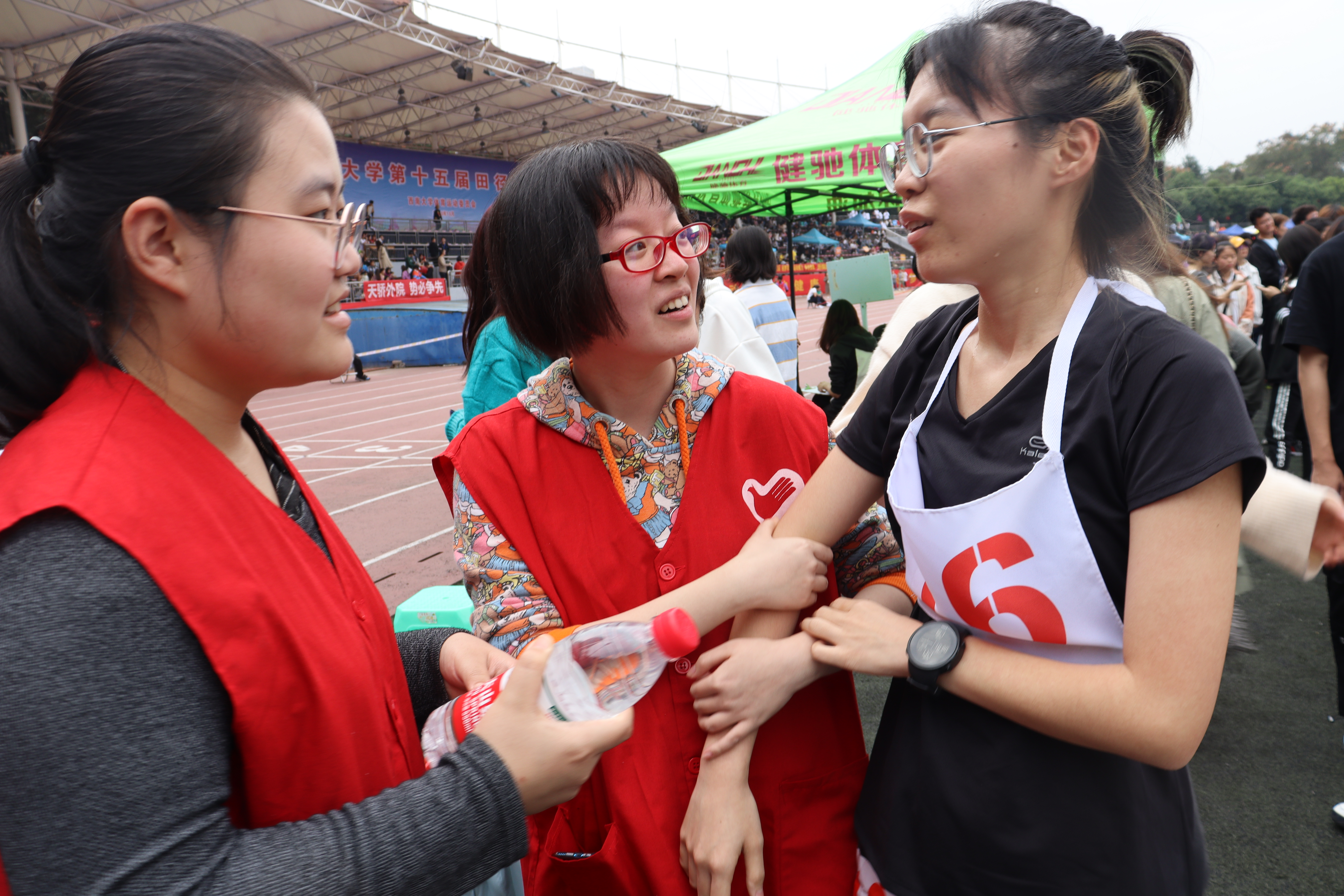 在赛场上奔走的,不仅是运动健儿们,还有热心的志愿者。他们身穿红色的马甲,正如他们真诚的心。默默付出,在终点处、赛道旁等待着,为运动员们送上及时的帮助与温暖的鼓励。