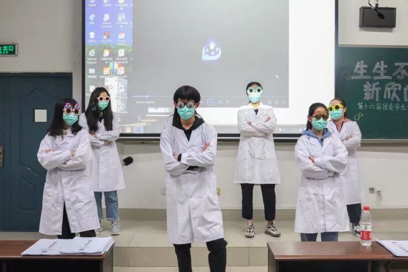 结束了庄重的成立大会,迎来了轻松有趣的破冰活动。在艺术团的开场表演之后,全场气氛高涨,每个人都情绪高昂。每个部门也都带来了他们精心准备的节目。团委组织部的舞蹈《爱河》,虽然成员们戴着口罩,穿着实验服全副武装,但在款式不一的墨镜加持下,却平添了几分炫酷;当代青年的烦恼是什么?团委学术科技部用经典的影视剧片段进行方言配音,告诉了我们问题的答案,既扎心又无法反驳,只得苦叹一句“淦”!“我是楚天霸,你可以叫我的小名,霸霸”团委宣传部的压轴短剧可谓精彩,男女反串、幽默剧情、夸张表演应有尽有,只有你们想不到,没有他们做不到……大家的节目一个赛一个的精彩,现场也是笑声不断,掌声不停。表演的中场还进行了小游戏——表情猜成语。每个部门都合力开动脑筋,连主席团也加入游戏。有游戏就有惩罚,吃柠檬片、芥末奥利奥、苦瓜的经历,大家也一定经久难忘。味道有多酸爽,情谊就有多难忘。