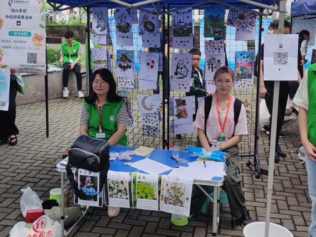 在学校樟树林挺拔的香樟下,志愿者们带领植物爱好者学习植物分类学知识,旁边的展位上,一些路过的游客正在体验制作植物拓印、叶脉书签等手工艺品。