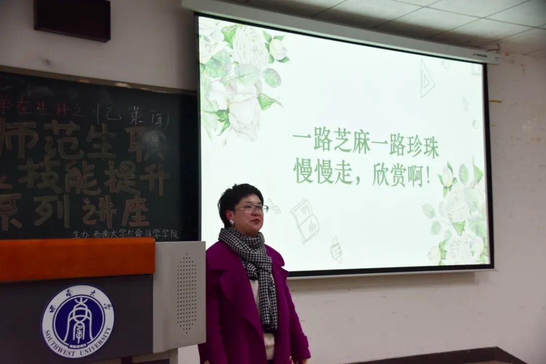为提升师范生职业能力,2021年11月12日,学院特邀西南大学附属中学李流芳老师面向学院公费师范生在10教502举行了题为“一个拾芝麻,捡珍珠的人”的专题讲座。这是学院“学在生科”之师范生职业技能提升系列讲座的第一讲。讲座由学院教学办公室主任祝顺琴老师主持。学院党委副书记石莹华出席活动。