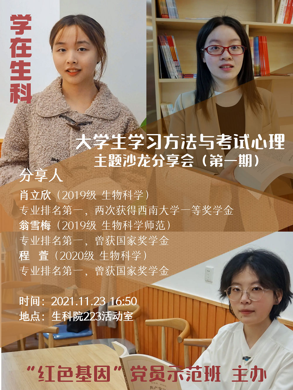 为进一步帮助低年级同学更好适应大学生活,优化大学学习方法,有效缓解学习压力,培养良好考试心理,11月23日下午,PA视讯“红色基因”党员示范班在223活动室举办“学在生科——大学生学习方法与考试心理”主题沙龙分享会(第一期),为充分发挥朋辈引领作用,本次分享会由三位示范班成员主讲,2021级和2020级部分本科生代表共计30余人参加分享会,分享会由2019级生物科学专业白南班肖立欣同学主持。