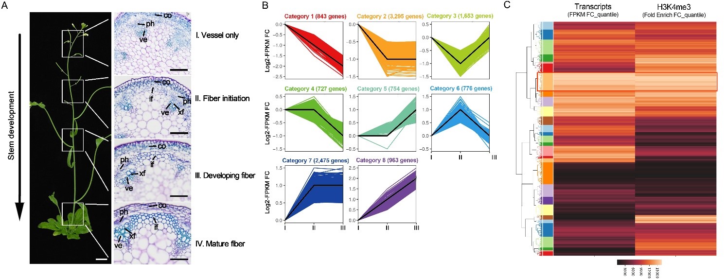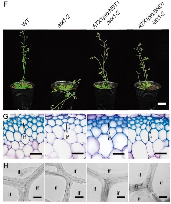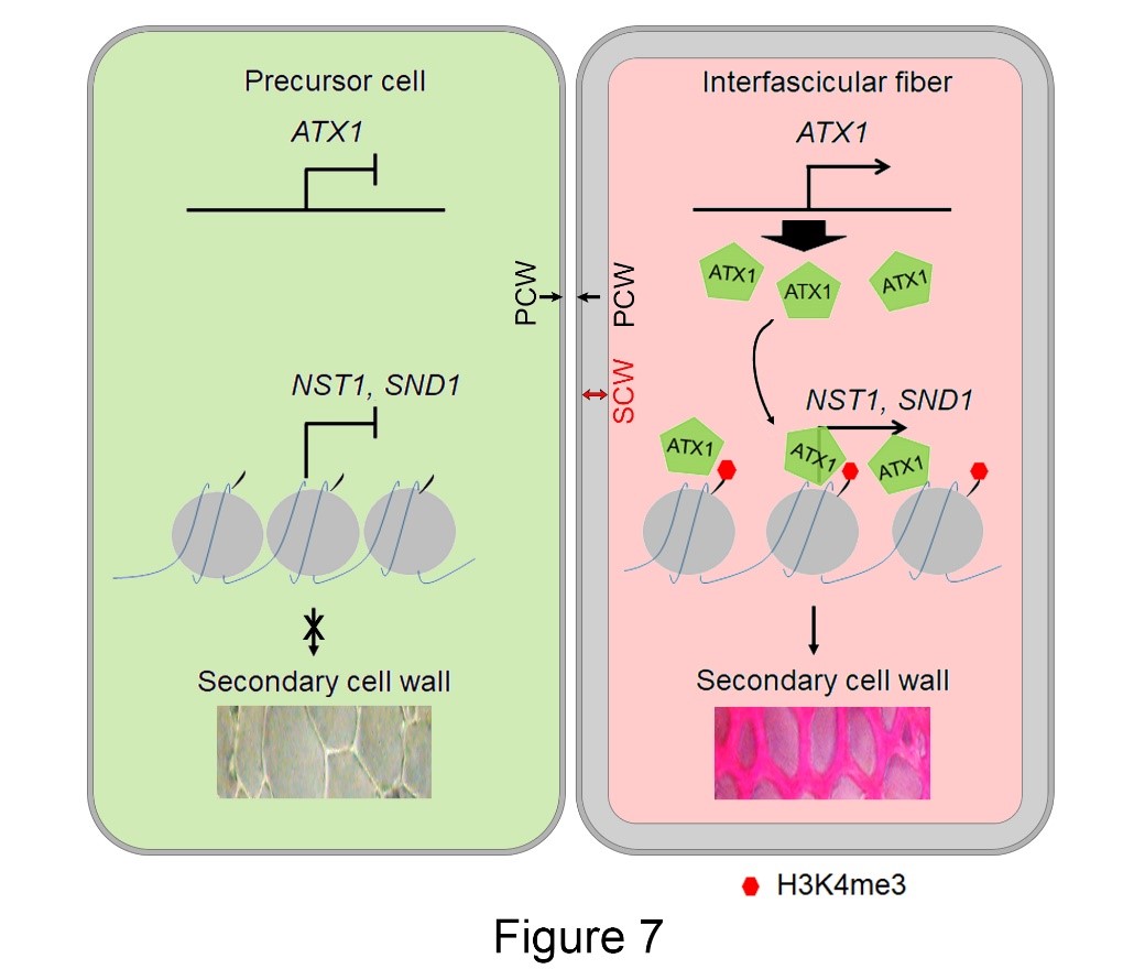 在本研究中,课题组发现H3K4组蛋白甲基转移酶TRITHORAX1 (ATX1)介导了拟南芥花序茎中束间纤维细胞次生壁发育的调节。全基因组分析显示,在茎发育过程中参与次生壁形成的基因表达上调主要受动态提高的H3K4三甲基化修饰水平的控制。在拟南芥所有H3K4me3的组蛋白甲基转移酶中,唯有 ATX1在茎的发育过程中特异的在束间纤维细胞中表达出来,并且ATX1的功能缺失突变导致了束间纤维次生壁的形成受损。遗传与分子结果表明,ATX1通过激活了次生壁NAC开关基因NST1和SND1的表达来正向调控次生壁的加厚。进一步分析显示,ATX1课直接结合NST1和SND1的染色质,并通过增加这些基因的H3K4me3水平,在茎发育的特定时期和细胞类型中来激活它们的表达。这些结果表明,ATX1在拟南芥茎发育过程中对束间纤维次生壁合成的调控起了重要的作用。