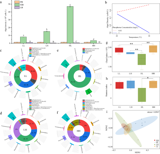 本研究通过对微生物群落的综合分析揭示了气候变化和营养负荷对拟柱孢藻水华的影响。气候和营养变化的协同效应增强了拟柱孢藻在蓝藻群落中的竞争优势。气候和营养变化的拮抗效应有利于拟柱孢藻水华的爆发,尤其是在约20°C的富营养化水体中(图1)。