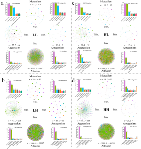 变形菌通常是互利和拮抗关系中的主导类群,而蓝藻则在侵略和利他关系中占主导地位;以蓝藻为主的利他主义在微生物交互中发挥着主导作用,非蓝藻细菌在这一过程中也发挥着重要作用,各种细菌类群通过种间合作共同促进了水华事件的形成(图3)。